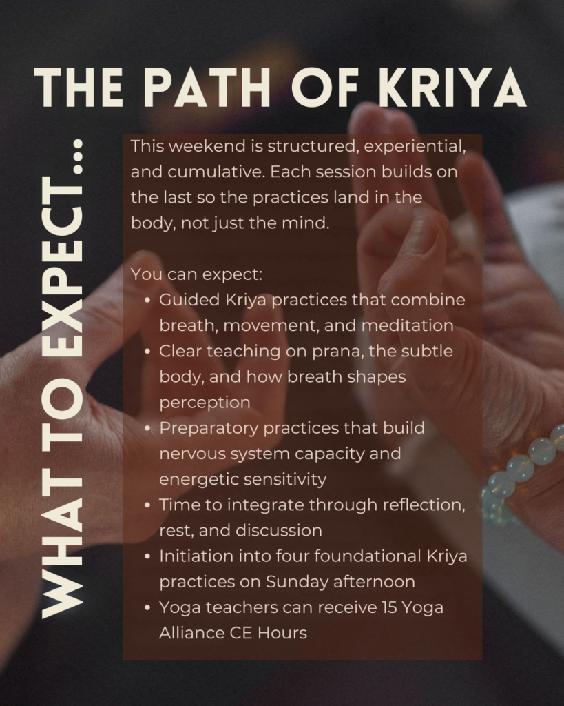 The most common question I’m getting about this is: What is “Kriya”? Kriya is a very specific, prescriptive sequence of postures (asanas), hand gestures (mudras), breathwork (pranayama), and mantras. These sequences are created as holistic remedies for common human experiences.